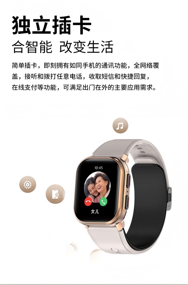 针对紧急情况,产品配备了一键SOS功能。长按特定按键后,手表将循环拨打预设的紧急联系人电话直至接通,结合内置定位功能,为用户提供双重安全保障。